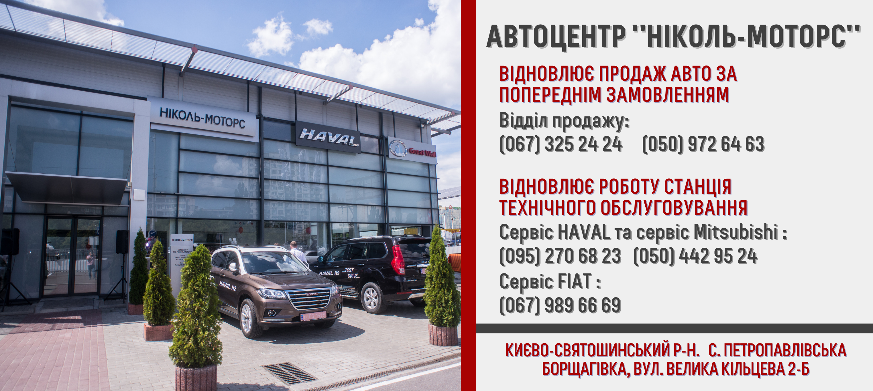 КонтактиНіколь-Моторс офіційний дилер Fiat в м.Києві та Київській області.Адреса: Київська обл, с.Петропавлівська Борщагівка, вул. Велика Кільцева, 2-Б.Автоцентр відповідає всім вимогам заводу-виготовлювача, показуючи високий рівень надання послуг у своїй роботі. На сьогоднішній день Ніколь-Моторс надає весь спектр послуг, необхідних при покупці і ремонтному обслуговуванні автомобілів марки під одним дахом. Ми запрошуємо клієнтів відвідати наш автосалон, в якому представлений повний модельний ряд автомобілів марки Fiat сервісний центр по обслуговуванню гарантійних і післягарантійних автомобілів і центр кузовного ремонту.